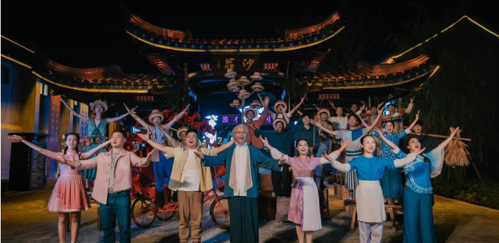 淮剧小镇位于九龙口旅游度假区,占地 350 亩,以国家 湿地公园为底色,以文华大奖淮剧《小镇》为蓝本,以国家 级非遗淮剧和杂技为依托,原景再现剧中十八个节点,形成 了主客共享、主客互动的“沉浸式”演艺模式。多维实景沉 浸式秀演《小镇有喜》,以“番外篇”的形式将淮剧《小镇》 以“演艺+实境秀”的形式情景再现。淮剧小镇在今年 4 月, 被江苏省文化和旅游厅认定为第三批省级夜间文化和旅游 消费集聚区。飞檐青瓦,石板小路。独特的空间风貌,随处 可见的淮杂元素,炫目的演艺节目让游客可以跨越时空走进 淮杂百年的前世今生,沉浸式体验非遗的魅力,感受人在画 中游景在画中走的夜市美景。淮剧小镇坚持“生态为本、文 化为魂、文旅融合”的发展理念,围绕“保留原乡感、留住 烟火气”的思路,按照“修旧如旧、建新如旧”的原则,突 出“两街四巷一湾一环多节点”的要求,对原沙庄村进行整 体提升,融入国潮、淮杂风,植入“吃住行、游购娱”业态, 致力打造集非遗传承、文化体验、美食畅享、沉浸演出、休 闲度假为一体的旅游集散地、文旅新地标