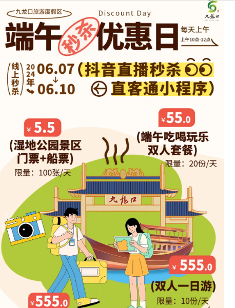五月初五是端午,端午佳节逢重五。既然端午节这么多“5”,这一次灵龙水乡端午“大放价”,“九”冲“5”来!¥5.5、¥55、¥555多档福利,线下打折,线上直接“打骨折”!赶快关注领取福利吧!
